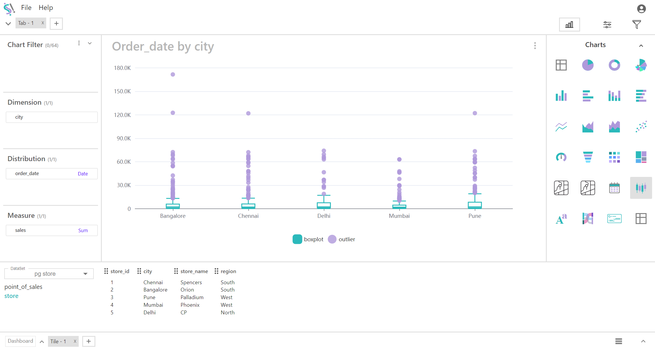 A box plot chart (or box-and-whisker plot) is a statistical visualization used to display the distribution of data and identify potential outliers. It provides a summary of a data set by showing the median, quartiles, and possible outliers. In a box plot with one dimension, one distribution, and one measure, the chart visualizes the spread and central tendencies of the measure across different categories defined by the dimension.