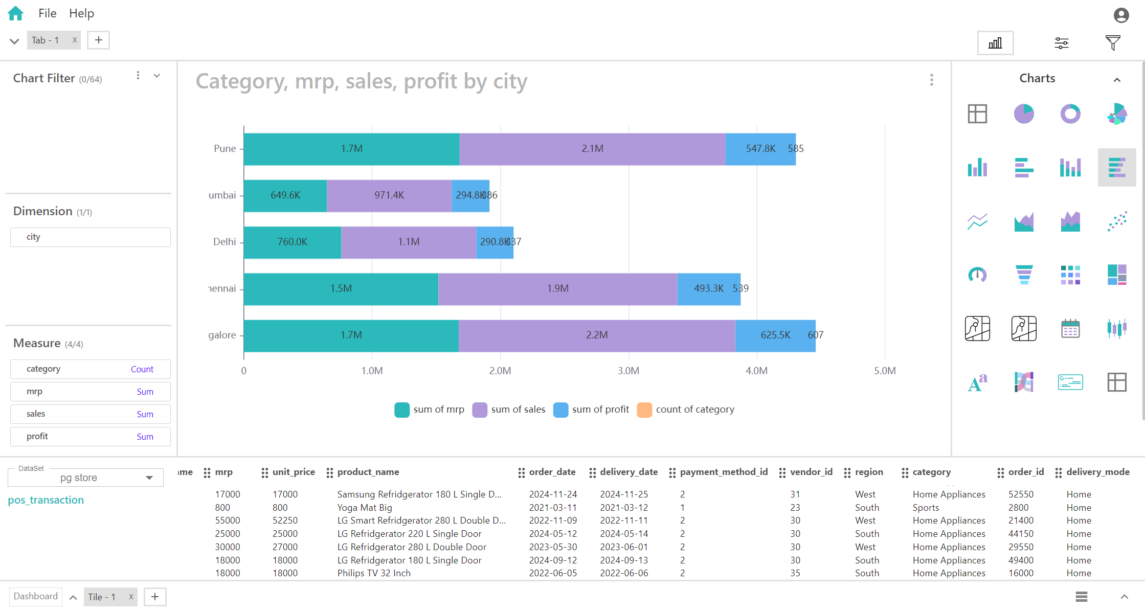 A horizontal stacked bar chart is used to display and compare the composition of multiple measures within a single dimension, with the bars oriented horizontally. When you have one dimension and four measures, each horizontal bar represents a category from the dimension, and the bar is divided into segments corresponding to the four measures.
