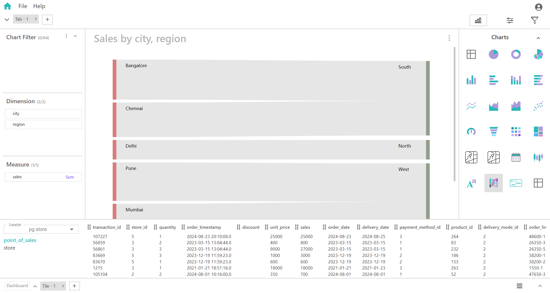 Represents the quantitative value that flows between the categories defined by Dimension 1 and 2. The measure determines the width of the flows in the Sankey chart. Provides insight into the size of the flows and helps visualize the distribution and proportions of the measure across different categories.