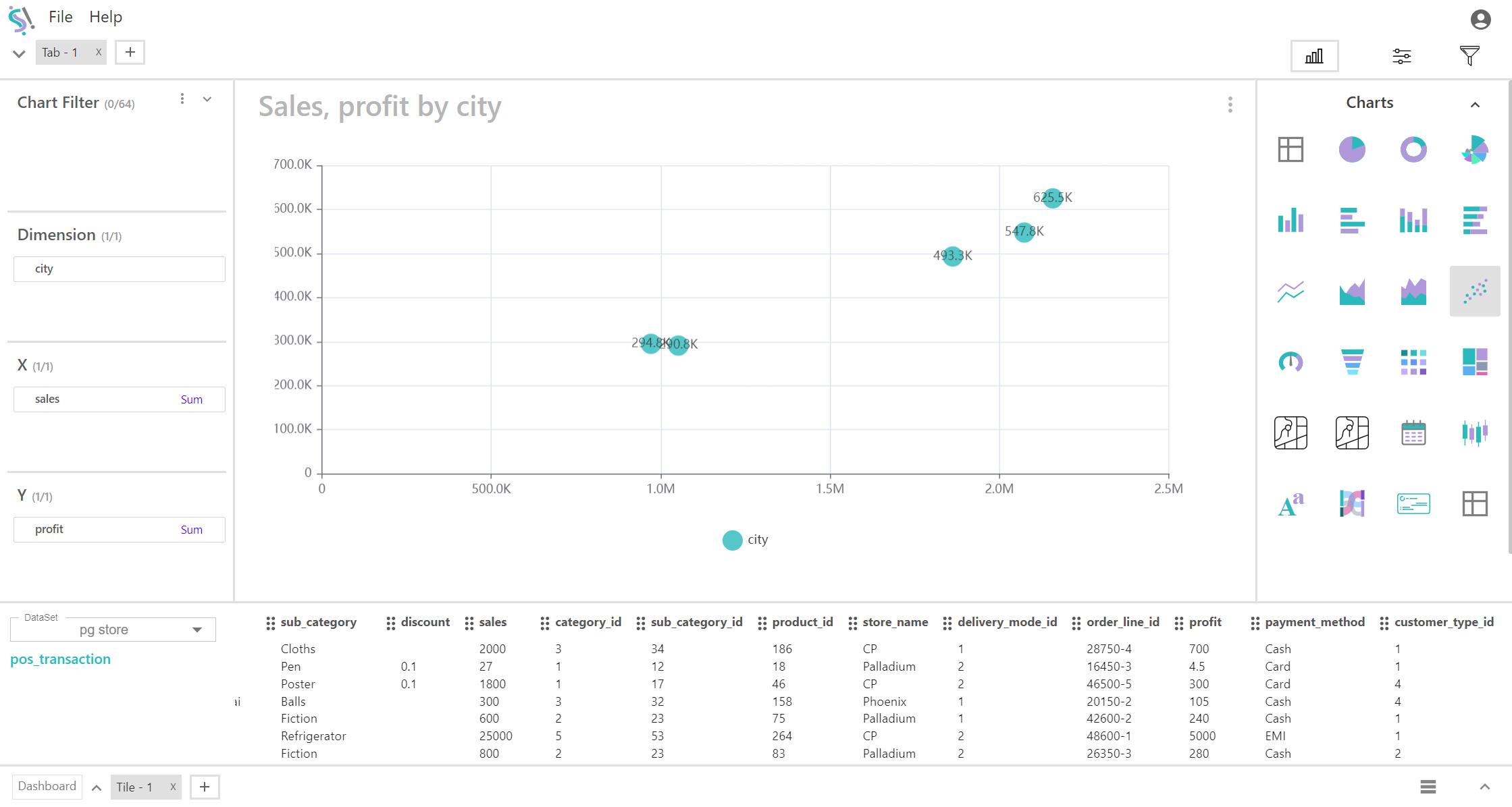 Represents a categorical or continuous variable that serves as the context for the data points on the scatter plot. This dimension is not directly plotted on the X or Y axes but can be used to group or filter the data. Helps in understanding how the relationship between the X and Y variables changes across different segments or categories.