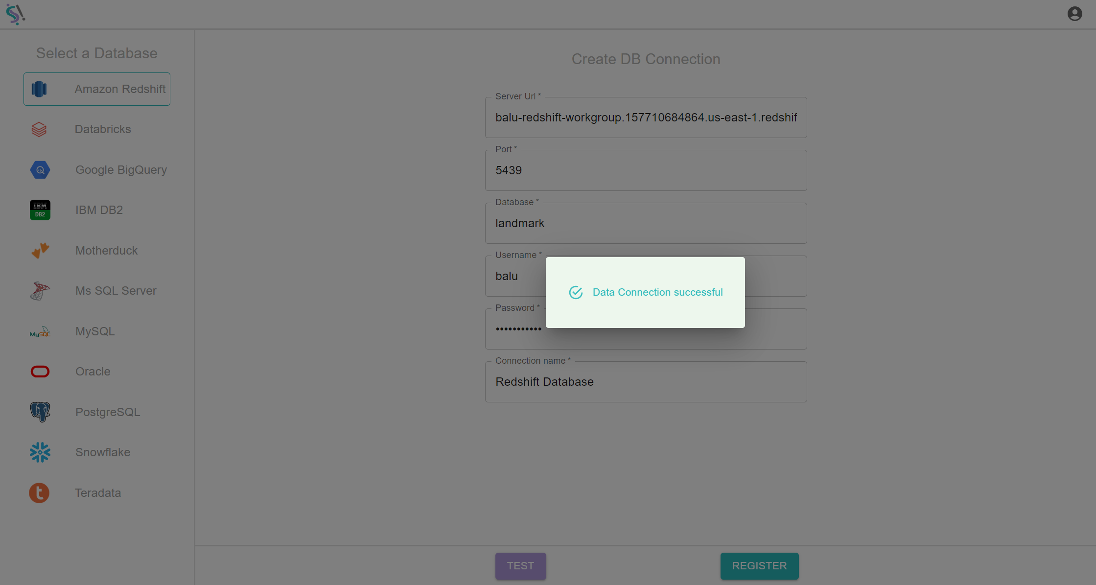 In Redshift, first do test connection process mentioned above, in this process if your test connection get passed then you will be get notification like Test Connection successful.